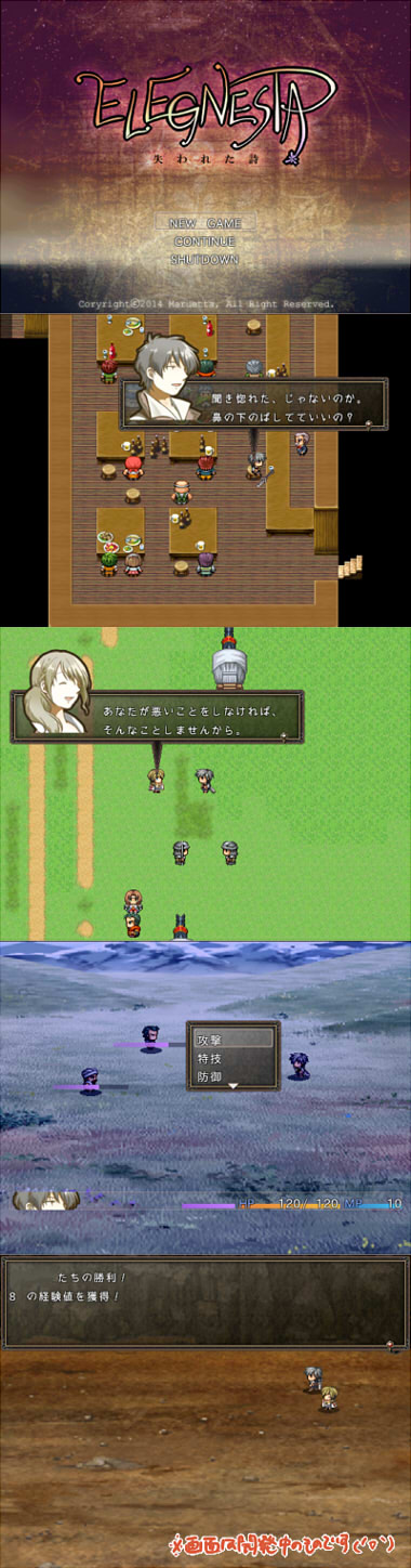 会話はWHITE-FLUTE様のマルチメッセージスクリプト、戦闘はRPG探検隊様のサイドビューとC Winter様のアクティブタイムバトルをお借りしています。デザイン部分だけちょっといじったりしました。