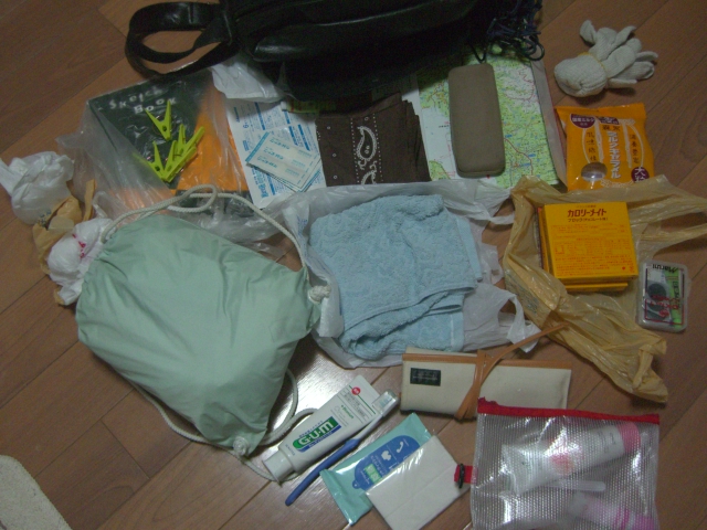 タオルにまさかの時の為の非常食(カロリーメイト・キャラメル)に洗濯バサミに歯磨き・洗顔セットに筆記用具にスケッチブック(使わないだろうけど念の為)に軍手にバンダナにパンク修理キットにシップに絆創膏に雨合羽に何かと便利な買い物袋に、そして九州ロードマップ。