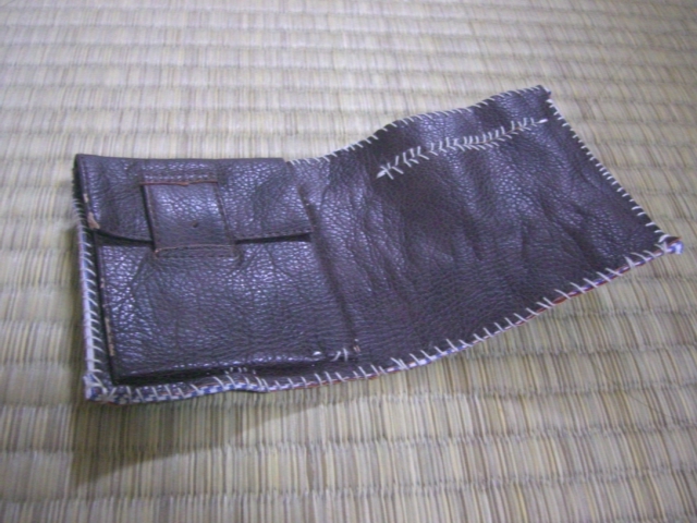 どうせ職もなくて暇だったのでもう履かないブーツ切り裂いて手縫いでチクチクしました。何気に裏地も付いてます。白と水色のボーダーの。腰に付ける分軽くてチャリ旅にはこれ以上ない程の軽量化財布です。